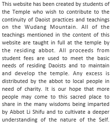 Taoism and Martial Arts Courses are offered throughout the year on scriptures, ceremonies, Traditional Taoist Medicine and healing, internal martial arts, Wudang Qigong, Wudang Tai Chi, Wudang Sword and more.