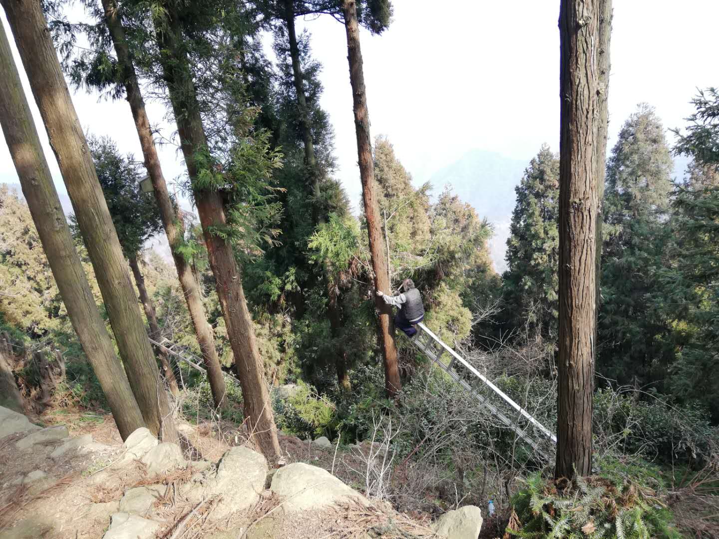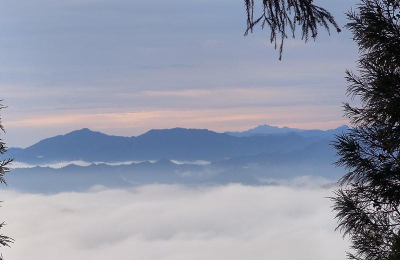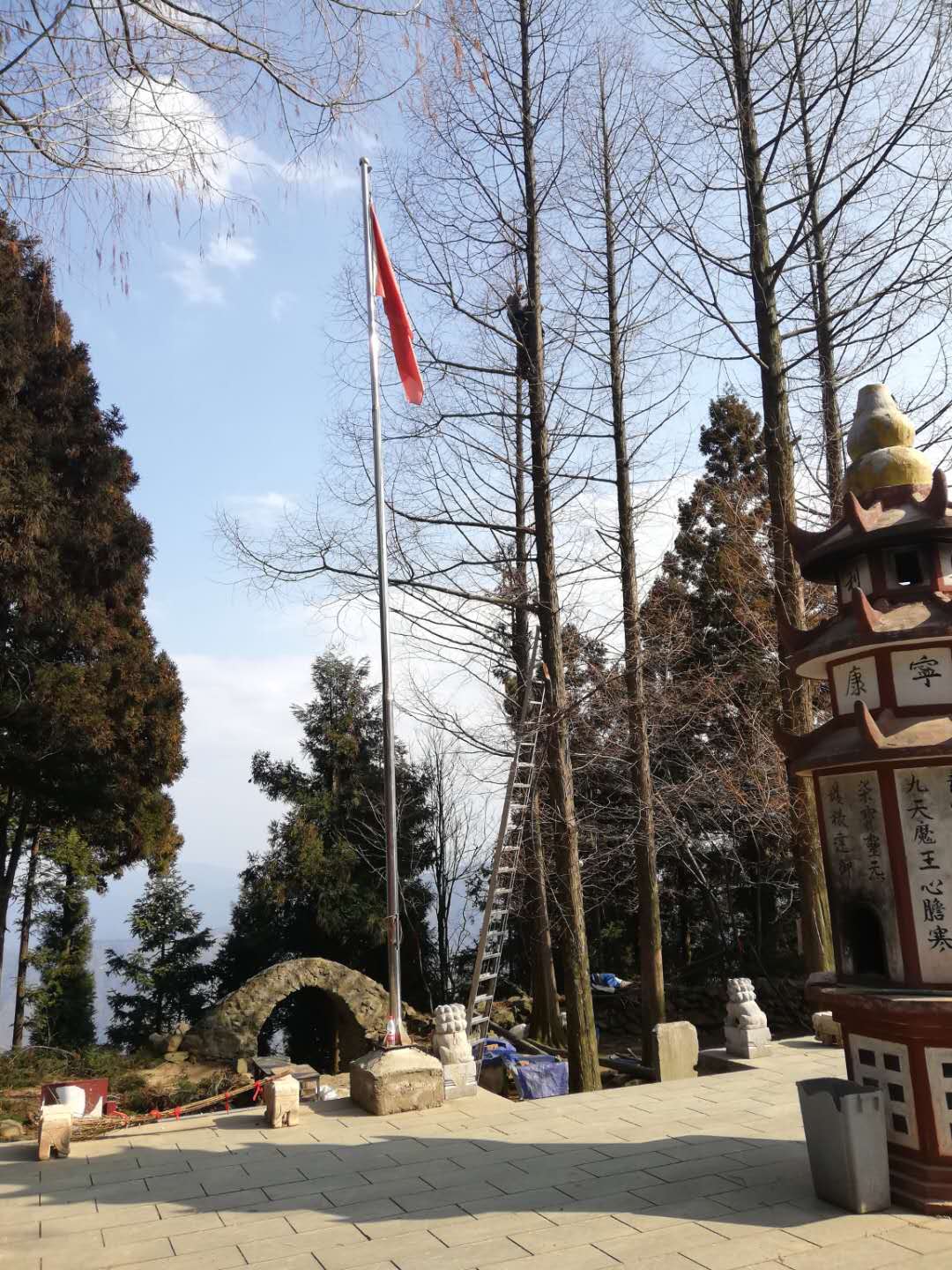 We have also trimmed the trees, Shifu is the only one allowed to be on top of the double extension ladder. He has the skill to do so, we do not. Now our morning practice is more beautiful then ever! Looking out over the mountains from our courtyard.