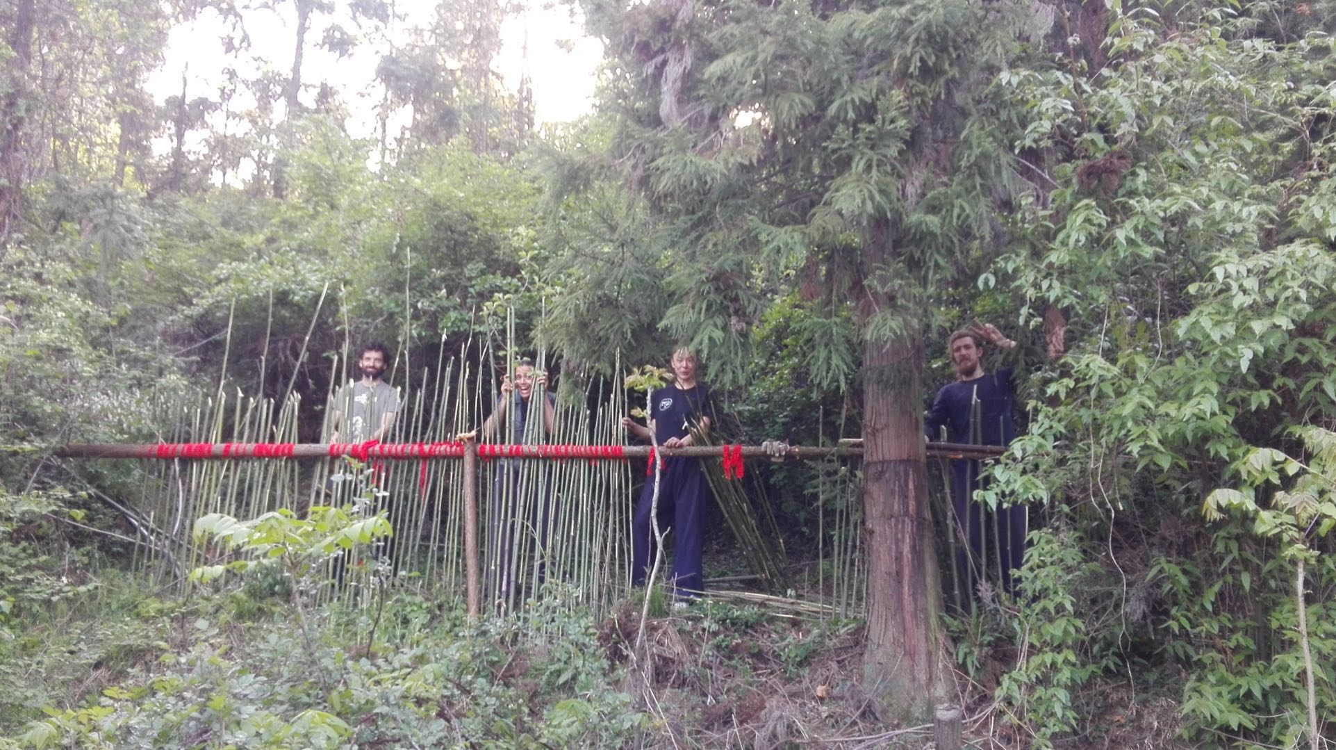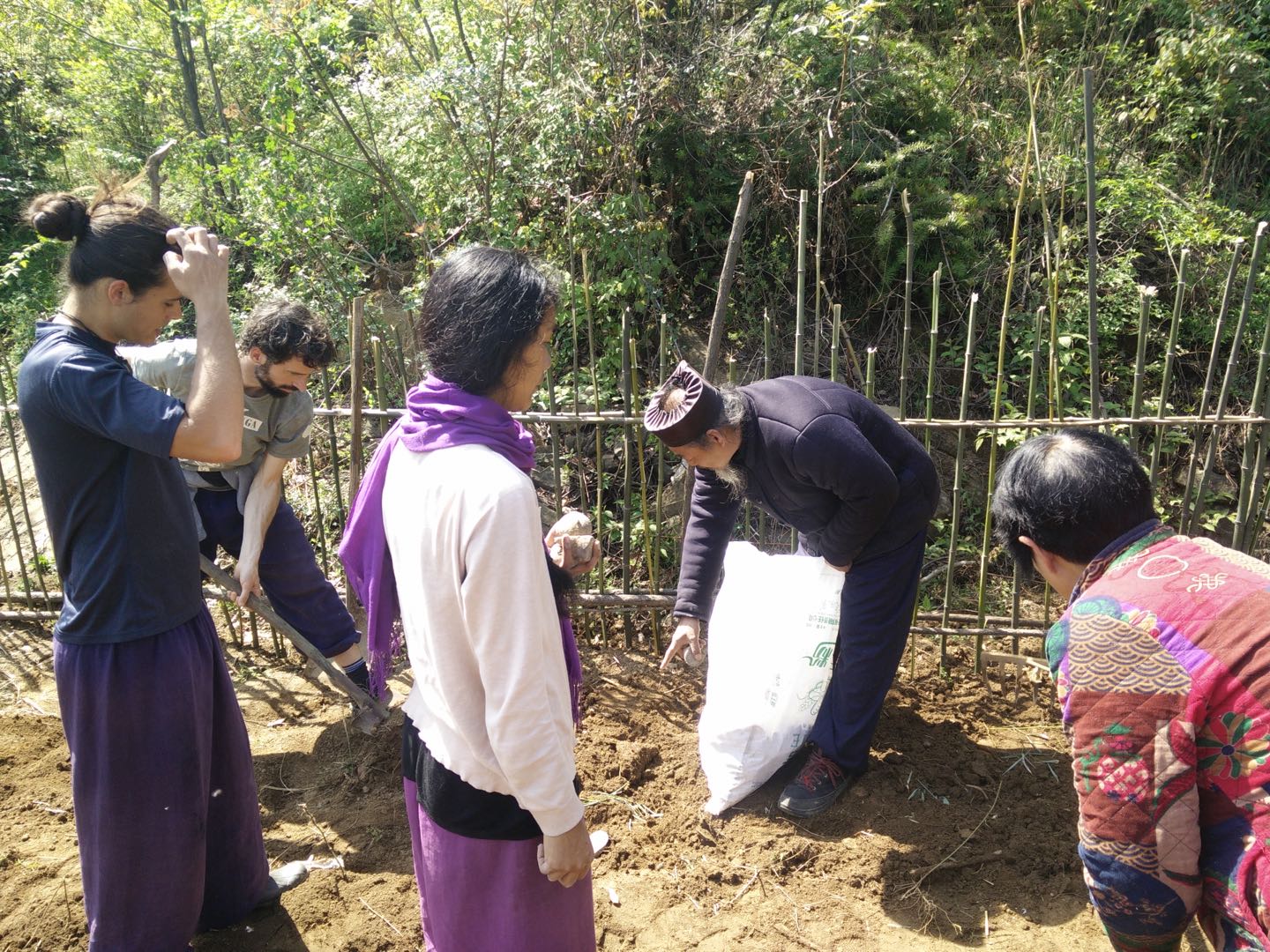 After an intensive week of training the Wudang Five Dragons Heavenly Dipper Dragon Shape Sword form, students worked in the gardens as a collective. We planted potatoes and corn, and prepared beds to grow more food. We also harvested lots of bamboos to build fences around our Herbal Medicine garden, and planted seedlings of Dang Gui (当归 Angelica Sinensis), Ban Zhi Lian (半枝莲 Scutellaria Barbatae), Di Fu Zi (地肤子 Kochiae Fructus), Tie Sao Zhu (铁扫竹 Indigoferae Bungenae), Chuan Xiong (川芎 Ligusticum Chuanxiong) and Pu Gong Ying (蒲公英 Taraxacum), along the dozens of other Chinese Medicine plants that have already been seeded in the garden over the years.