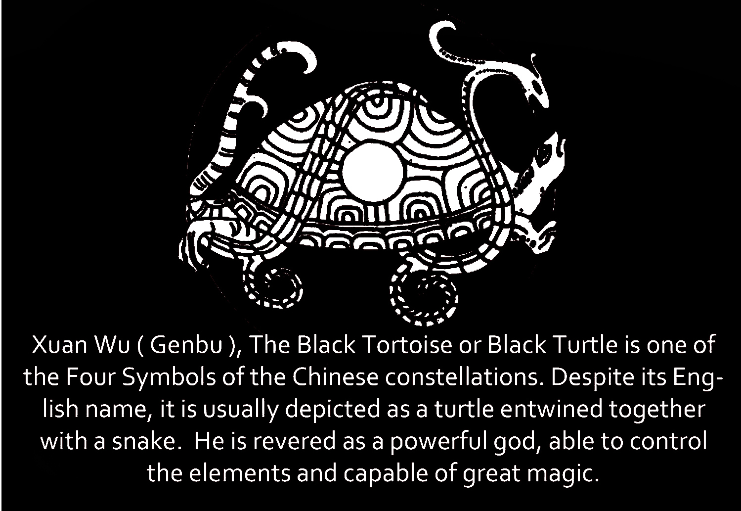 Another link between Daoism and turtles involves Xuanwu. Martial artist, immortal, guardian of the north, he is especially revered in the Wu Dang mountains, the place where he is said to have attained immortality. Because a black turtle entwined with a snake is the symbol of the North in Chinese astronomy, Xuanwu is often depicted with a turtle and snake.