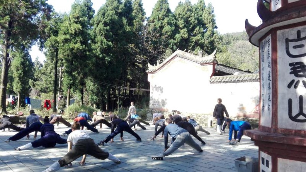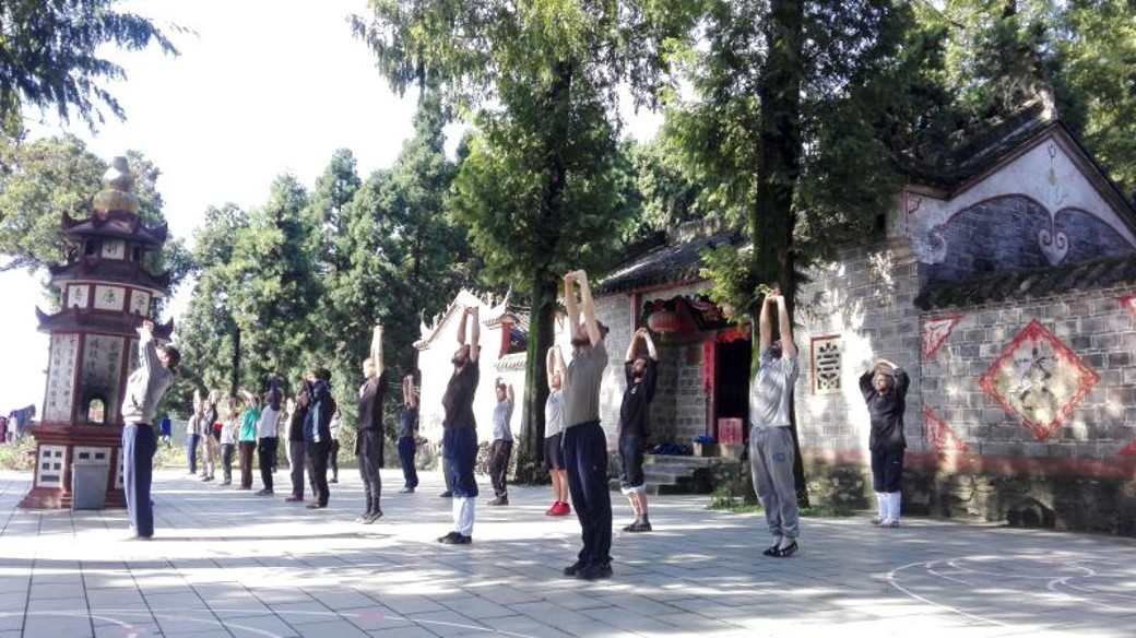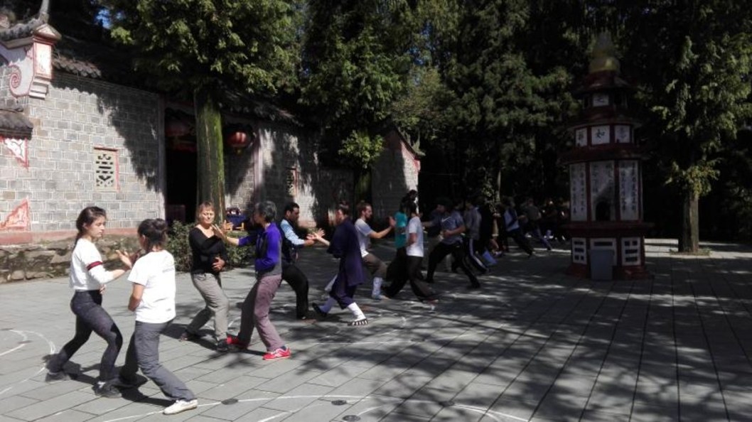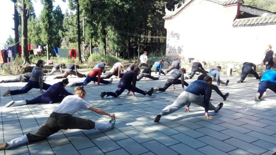 Everyone has been very excited to train the physical aspect of the course out in the front courtyard for these last few days. After Shifu’s demonstrations, he’s checking and correcting everyone’s stances and movements on the taijiquan form and push hands.