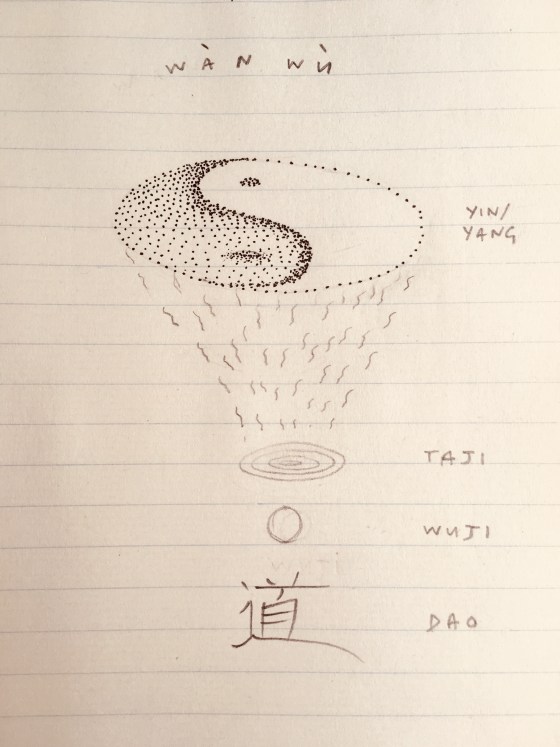 “In the beginning was the word, and the word was God.” Was it a sound wave that came from the void, disturbing the equilibrium of Wuji, to create yin and yang – the world of duality? Like we see in Cymatics, when a tone vibrates matter it forms into geometric patterns. In this case, a most unifying and total mandala, the Taiji symbol…”