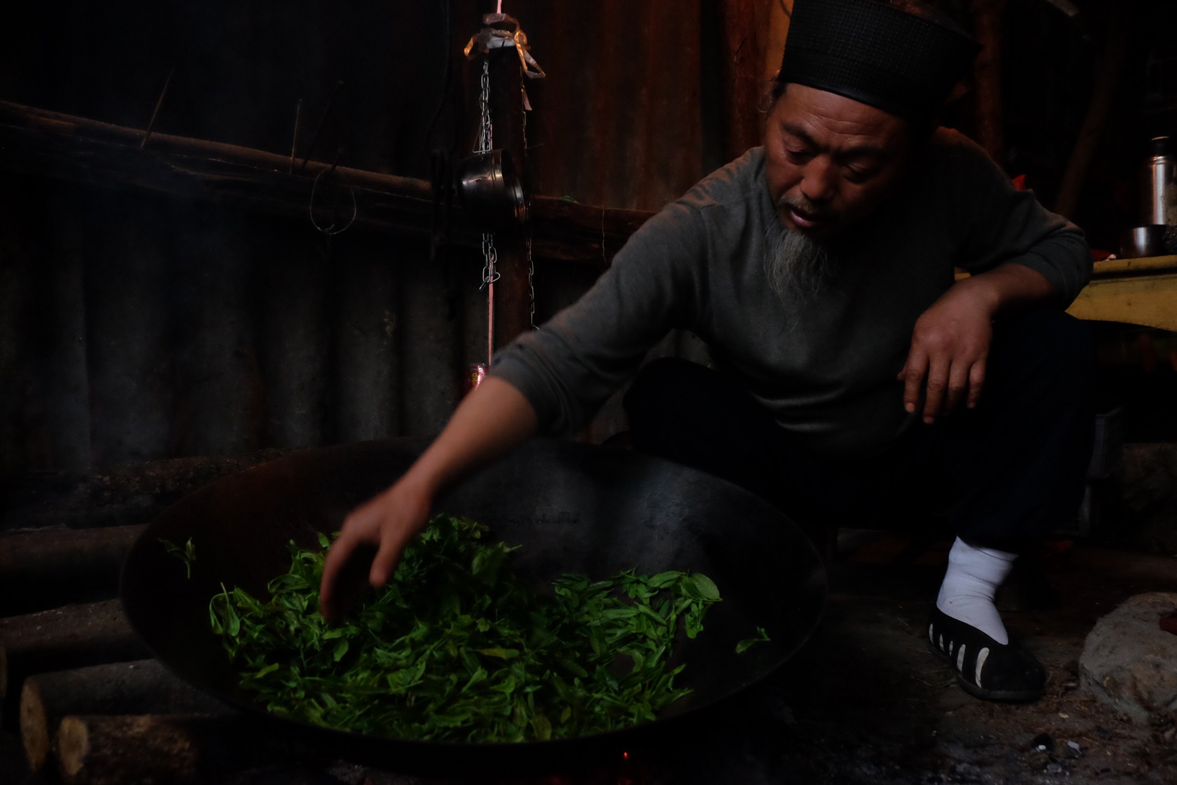 For the next part, the fire is decreased into a smouldering fire with which the remaining moisture of the leaves is removed. Again the leaves are continuously turned, but this time with much less force, as not to crush the now hardening and crumpled up leaves. If too much strength is applied, the tea leaves will break into very small fractions. When the dried leaves in the wok generate a sort of high-pitched sound when they hit the wok’s surface upon turning, the tea making is nearing its final stage. If the final tea product contains yellow or black tea leaves, it is due to lack of caution when turning the tea leaves inside the wok, which results in them being burnt.