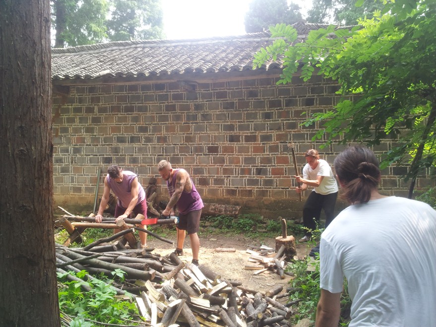 Also work was carried on as usual: this week we chopped some wood and carried a lot of vegetables up the mountain. A special note goes for Irish student Cheng Wang who beaten the previous record for vegetable carrying with 48kg up the steep path that goes from the village to the temple.( After we weighted the bag the news arrived shortly to everyone who cheered him noisily( or with enthusiasm)), although Shifu was not very pleased and said that when we carry things up the mountain we should just use seventy percent of our power so that we train our strength but we don’t risk to injure it.