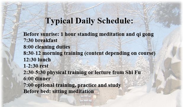 Students will stay in the living quarters within the temple (1-3 persons per room, men and women in separate quarters). Three meals provided everyday; all vegetarian Chinese style dishes cooked over a wood fired wok. If a student needs to eat meat they can purchase it and/or cook it in one of the kitchens outside of the temple, however storing it might be an issue. Students should be prepared to meet the living conditions here: wooden beds, insects, squat toilets, earthen and concrete floors, moist environment and mold. There is a shower room with warm water where students may bucket bathe conservatively meeting the rules and regulations.