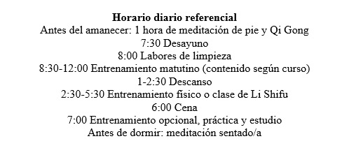 Los contenidos a estudiar son dinámicos y cambian de acuerdo a cada grupo de estudiantes. Mantenemos grupos pequeños para asegurar la calidad en la enseñanza y un ambiente familiar. Todos los cursos sobre Taoísmo y Artes Marciales son enseñados por Li Shifu con la asistencia y traducción de Instructores o Discípulos Senior (avanzados).