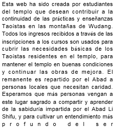 Este lugar no es una escuela o una academia de artes marciales, es un templo y un hogar para una familia. Este es el único lugar en Wudang donde los extranjeros pueden alojarse y estudiar Taoísmo y Artes Marciales dentro de un templo de forma legal. Es por ello que uno debe respetar las reglas del templo y los preceptos Taoístas. Uno debe ser capaz de aguantar la amargura, seguir los planes y arreglos con disciplina, unirse y apoyarse mutuamente los unos a los otros con amor, compasión, bondad, así como comprender el concepto de ganancia y pérdida. Uno debe estudiar palabras y frases simples del idioma Chino. Uno debe estudiar y tomar parte en los quehaceres y tareas diarias del templo, por ejemplo, estar a cargo de las estancias, de encender incienso, barrer, limpiar, etc. Se alojan de una a tres personas por habitación. La dieta es vegetariana dentro del templo. Si en dos semanas uno no se acostumbra o es incapaz de aguantar las condiciones, puede renunciar. Si uno viola las reglas deberá irse. Cada curso tiene una cuota mínima de personas. Li Shifu enseña personalmente el contenido de los cursos. Estudiantes futuros también pueden elegir venir de visita al templo por tres días para ver las condiciones, tiempo durante el cual la comida y el alojamiento no tendrán costo alguno.