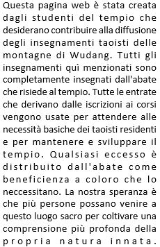 Questo luogo non e’ una scuola ne un’accademia di arti marziali, questo e’ un tempio ed e’ la casa di una famiglia. Questo e’ l’unico luogo in Wudang dove gli studenti possono risiedere e studiare Taoismo e arti marziali all’interno di un tempio. Per questo uno deve impegnarsi a rispettare le regole del tempio e I precetti Taoisti. Deve essere in grado di soppportare asperita’, seguire I piani con disciplina, unirsi e supportarsi a con gli altri con amore, compassione, gentilezza e inoltre capire il concetto di guadagno e perdita. Deve impegnarsi a studiare semplici frasi cinesi di uso comune. Se entro due settimane uno non dovesse essere in grado di supportare le condizioni puo’ abbandonare. Se uno dovesse violare le regole dovra’ ritirarsi e abbandonare il tempio. Ogni corso ha un numero massimo di studenti, Li Shifu insegna personalmente tutto il contenuto dei corsi. I futuri studenti possono anche visitare il tempio per 3 giorni per vedere le condizioni, il cibo e le accomodazioni sono gratuite. E’ necessario prendere parte nelle attivita’ e nei lavori di tutti I giorni per esempio prendersi cura degli altari, dare l’incenso, spazzare e pulire e cosi’ via. Due persone sono accommodate in ogni stanza, la dieta e’ vegetariana.