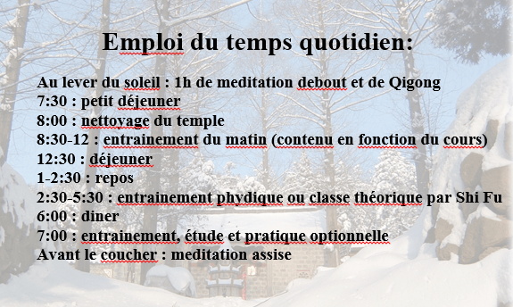 Cet endroit n’est pas une école ou une académie d’arts martiaux, c’est un temple où l’atmosphère est familiale. C’est le seul endroit à Wudang où des étrangers peuvent légalement loger et étudier le Taoïsme et les Arts Martiaux dans un temple. C’est pourquoi chacun doit respecter les règles du temple et les préceptes taoïstes. Chacun doit être en capacité d’endurer l’amertume, de suivre le programme et l’organisation avec discipline, de s’unir et de se soutenir mutuellement avec amour, compassion, gentillesse ainsi que de comprendre le concept de gain et de perte. Chacun doit étudier les termes et les phrases de base du Chinois. Si au bout de deux semaines, vous n’êtes pas en mesure d’endurer les conditions, vous pouvez abandonner. Si vous enfreignez le règlement, vous devrez vous retirer et partir. Le nombre d’étudiants maximum pour chaque cours est de 14 personnes. Li Si Fu enseigne personnellement le contenu de tous les cours. Les futurs étudiants peuvent aussi venir visiter le temple pour 3 jours pour se rendre compte des conditions de vie – la nourriture et le logement leur seront offert. Chacun doit étudier et prendre part aux tâches quotidiennes du temple, par exemple avoir à charge l’entretien des autels, allumer l’encens, balayer et nettoyer, etc… Deux personnes sont logées par chambre, le régime alimentaire est végétarien à l’intérieur du temple.