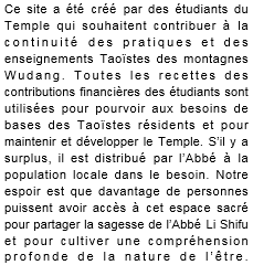 Le Temple des Cinq Immortels de Wudang en Chine est un petit endroit retiré dans les montagnes, accueillant tous ceux qui cherchent à se former dans les Art du Tao. Venez étudier sous la direction du Maître Li Song Feng (Li Shifu) des Monts Wudang. Faîtes l’expérience du mode de vie et de la vision du monde taoïste.